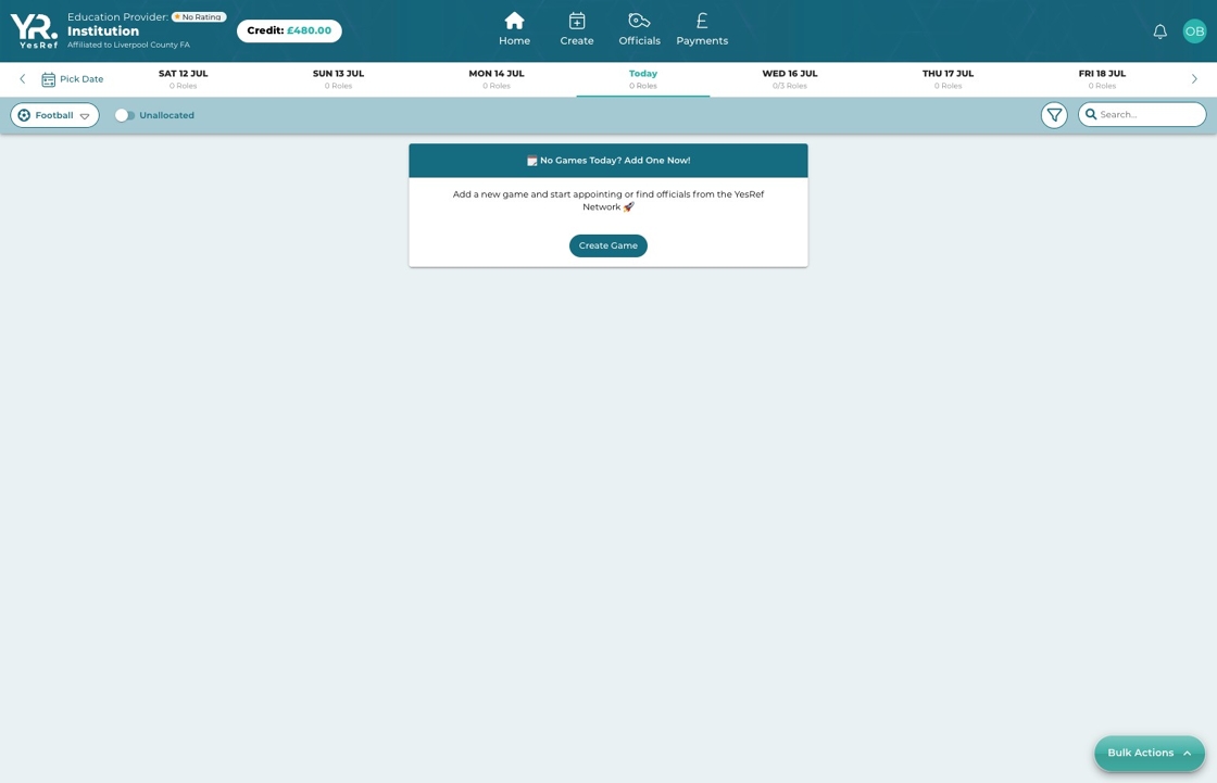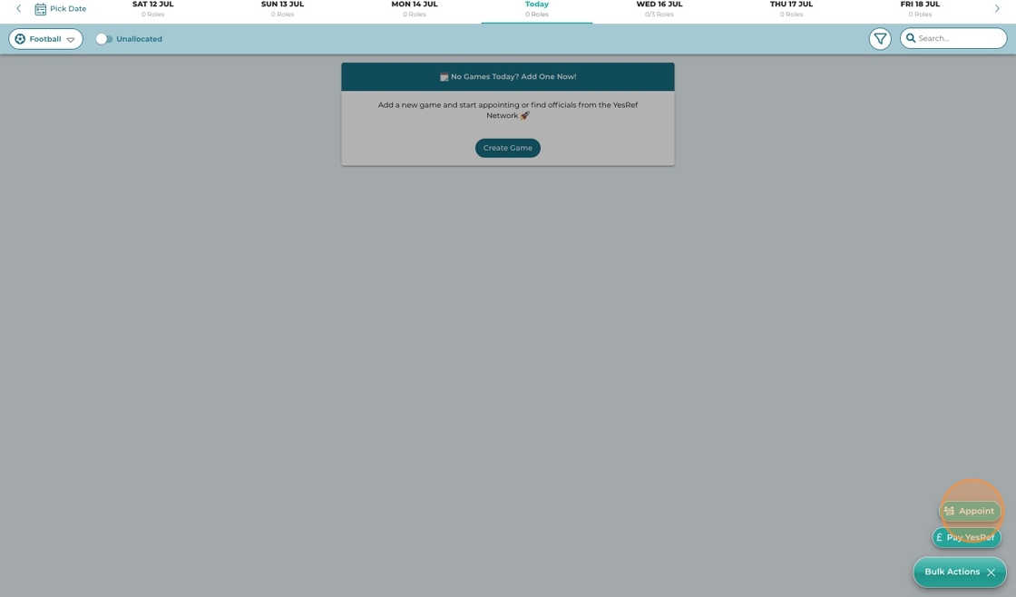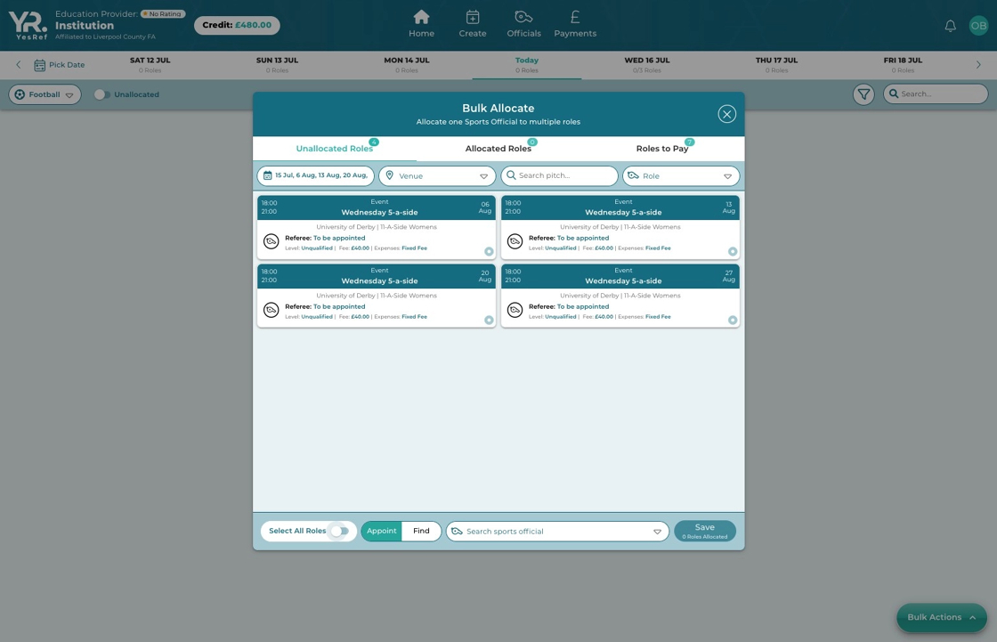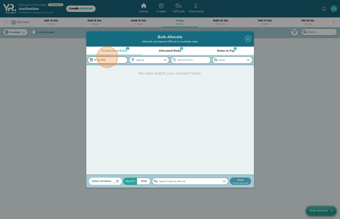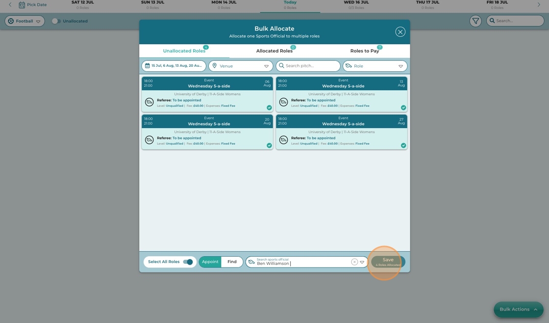 - Here you can set a date range, select a particular Venue, a Pitch or a Role