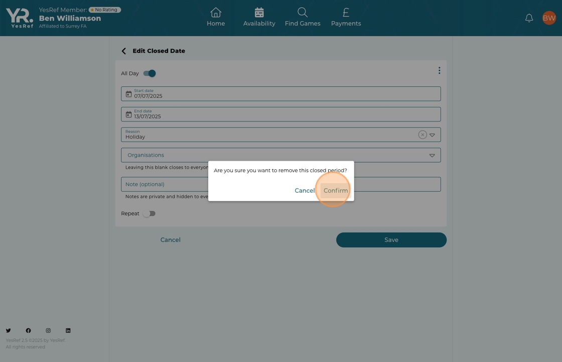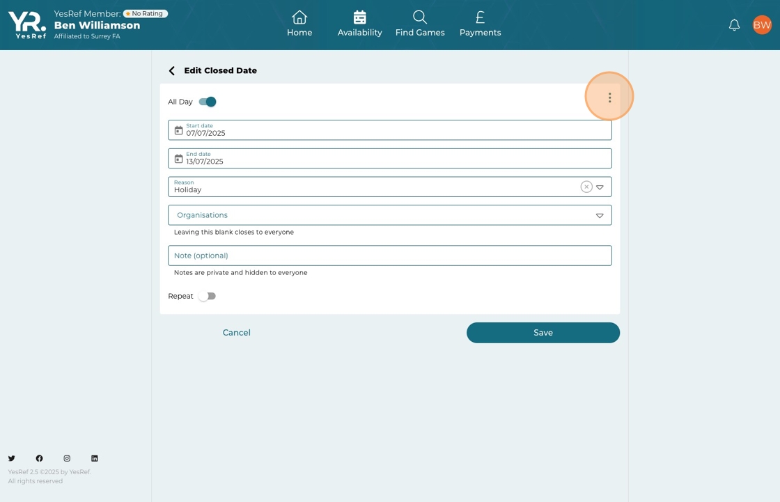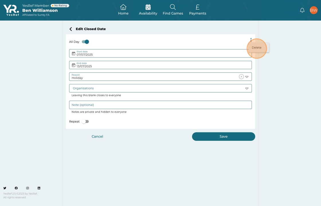 This guide offers a straightforward method for efficiently deleting specific closed dates in YesRef, helping you manage your calendars with ease. By following the outlined steps, you can quickly remove unwanted closed dates while ensuring that your availability to Sports Providers is accurate and up to date.