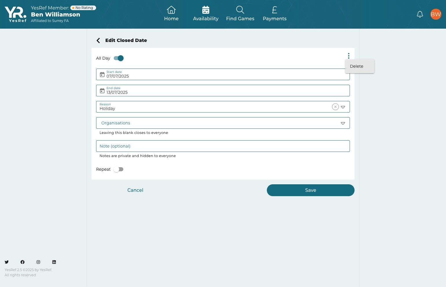 This guide offers a straightforward method for efficiently deleting specific closed dates in YesRef, helping you manage your calendars with ease. By following the outlined steps, you can quickly remove unwanted closed dates while ensuring that your availability to Sports Providers is accurate and up to date.
