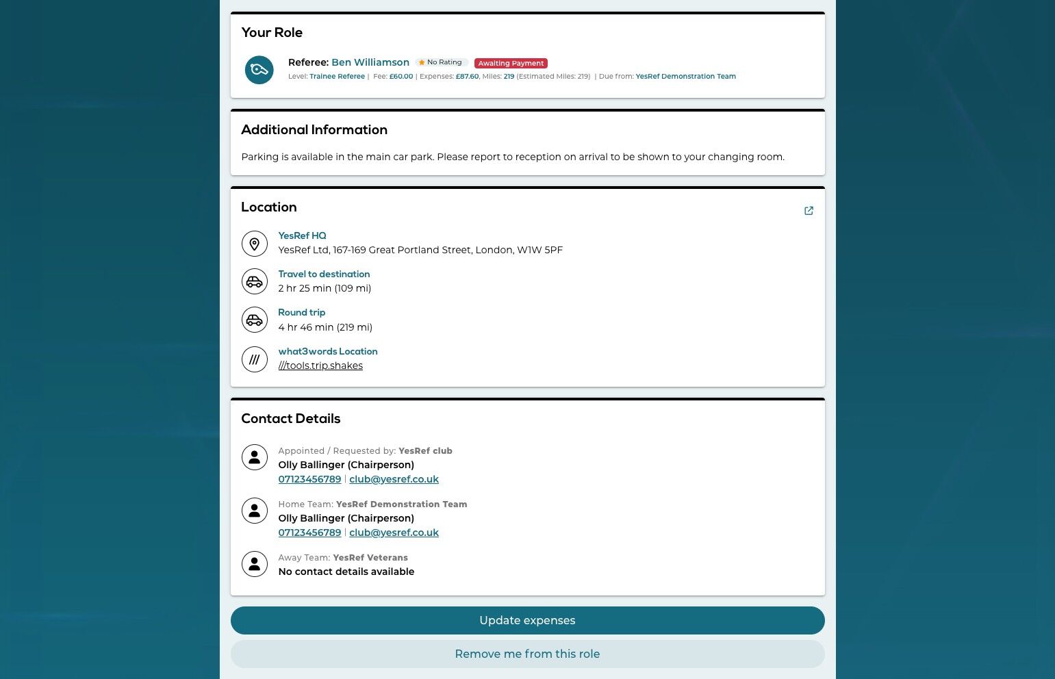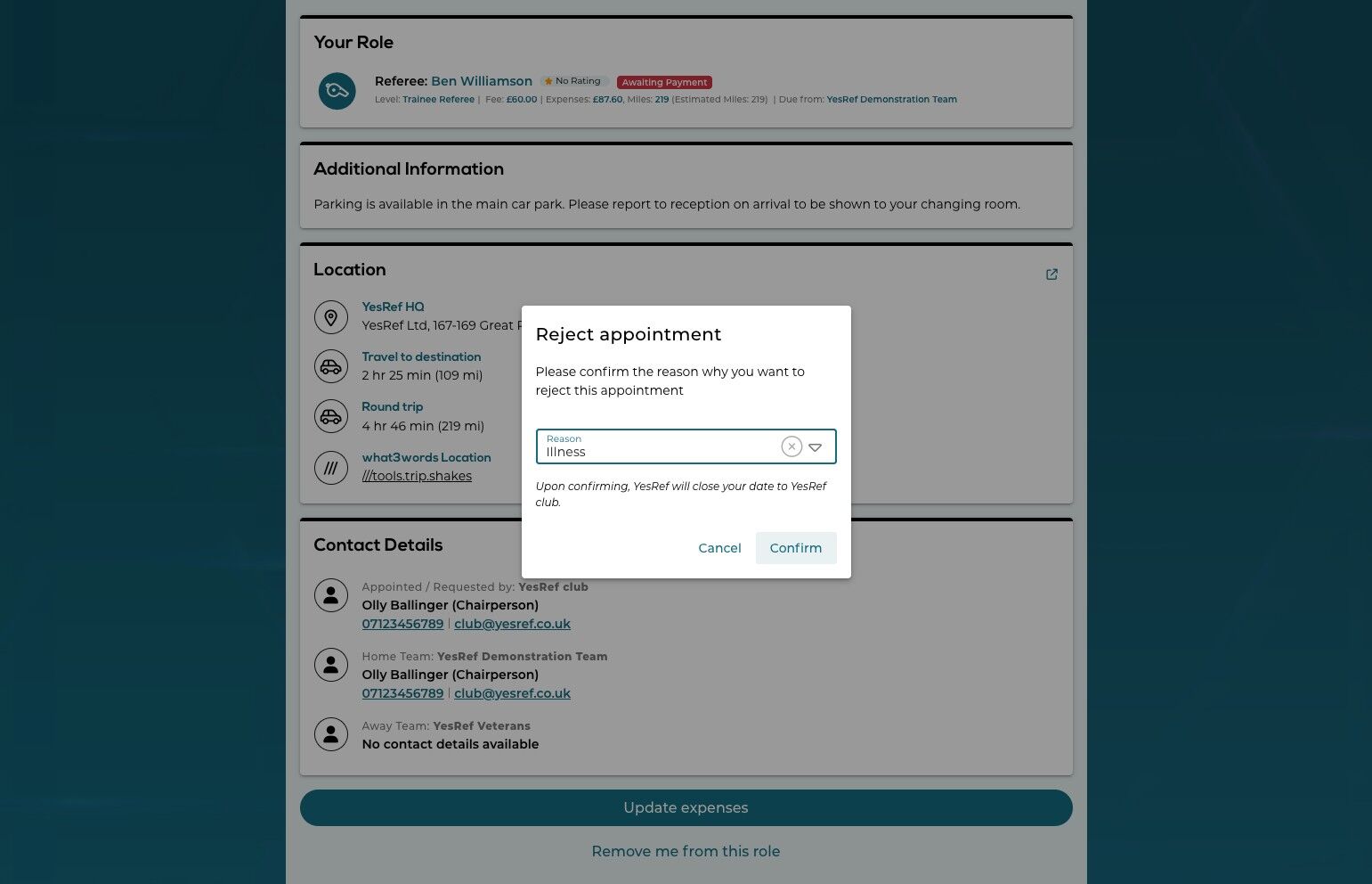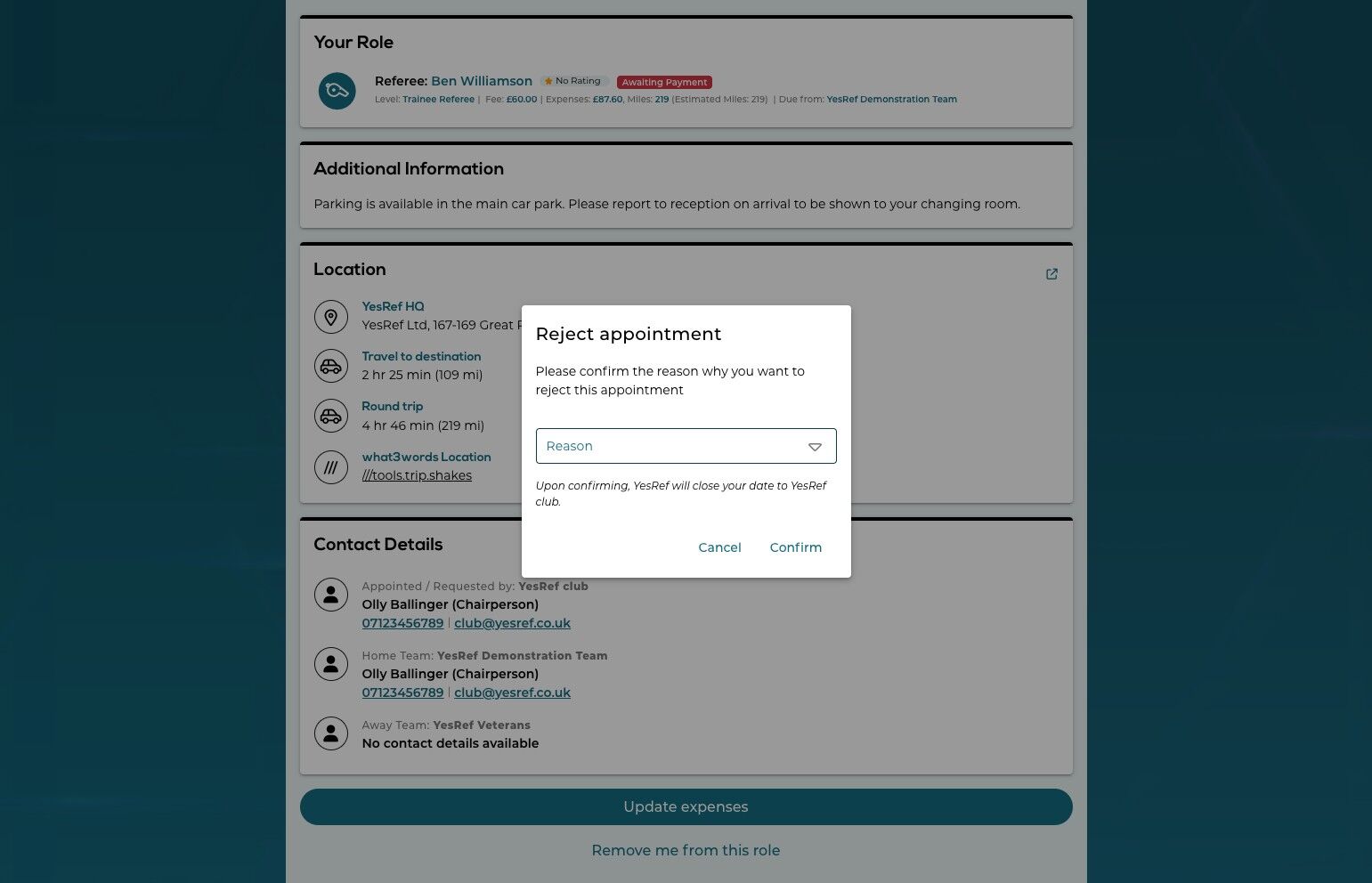 Articles on: Sports OfficialsHow to remove yourself from a RoleLogin to YesRefSelect "More Details" on the game you wish to be removed fromClick "Remove me from this role"Select a reason from the drop down menuClick "Confirm"Updated on: 30/06/2025