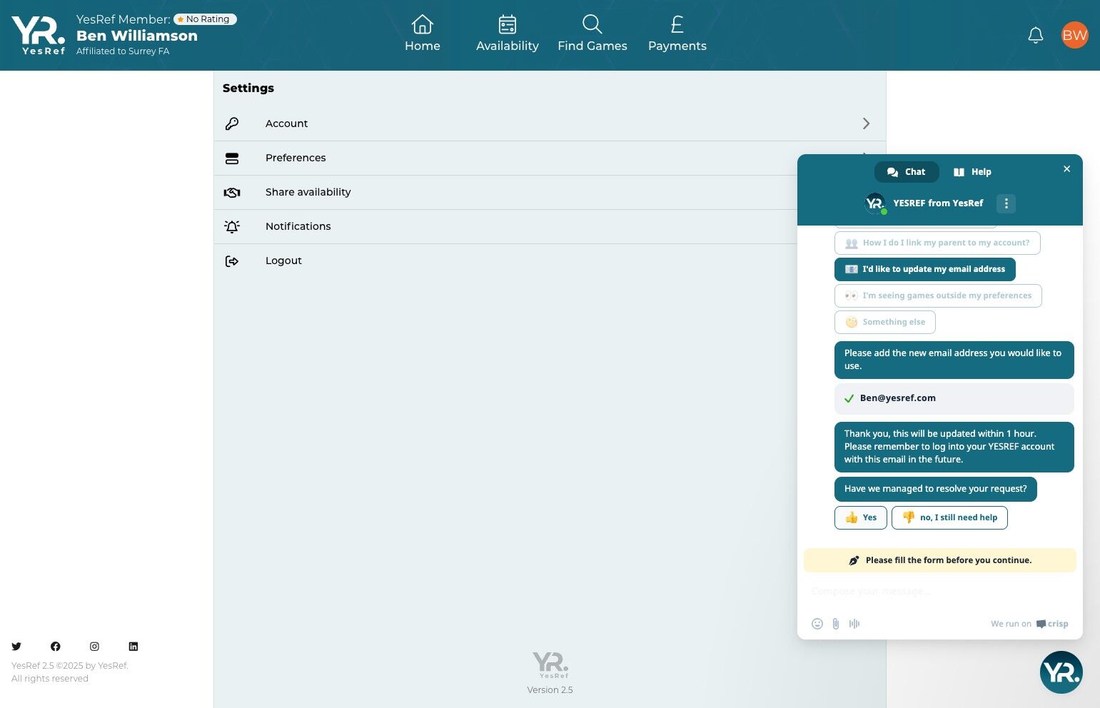 - The YesRef team will update your email address. Click YesRef to resolve the convesation